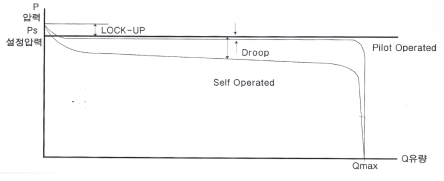 14) Droop이란 Regulator의 사용유량이 증가함에따라 발생하는 출구압력의 저하를 말한다. 이것은 시험된 데이타이고, 저유량에서 출구압력의 설정치와 설계 최대 유량일때의 실제 출구압력과의 차이를 나타내며 백분율(%) 또는 여러 가지 압력단위를 사용해서 표기된다.